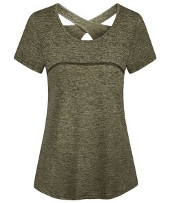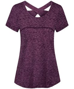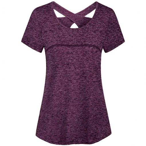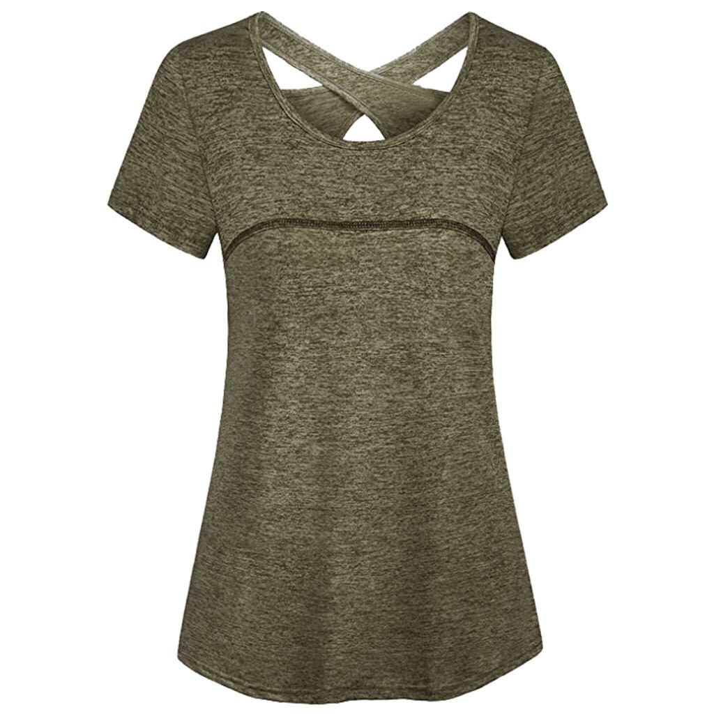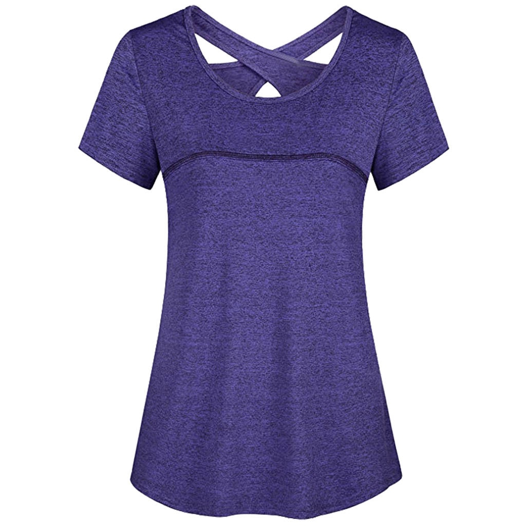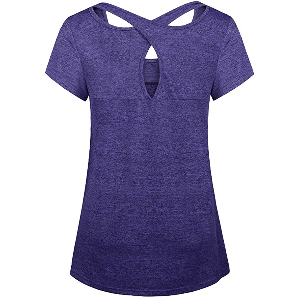 Woman Short Sleeve Round Neck Criss Cross Back Athletic Yoga Shirt
