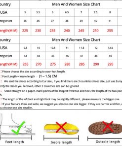 Note 1 : Please choose the size according to your foot length. Note 2 : Foot Length = insole length –(1–1.5) CM Note 3 : We sent the shoes according to Eur size , If you find there are 3 countries shoes size, just use Europe size chart to verify the shoes you received, other 2 countries size can be ignored Note 4 : Stand straight on a paper, mark points of the longest front toe and heel, the length of the two points is the foot length. Note 5 : The length of the left foot and right foot may be slightly different , please measure the bigger one. Note 6 : If your feet are think and wide, we suggest you choose one size bigger. if they are narrow and thin, we suggest you choose one size smaller.